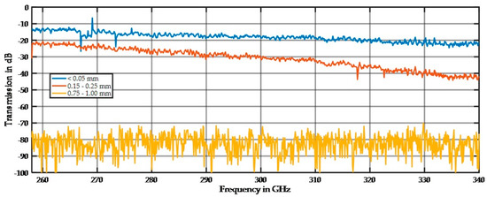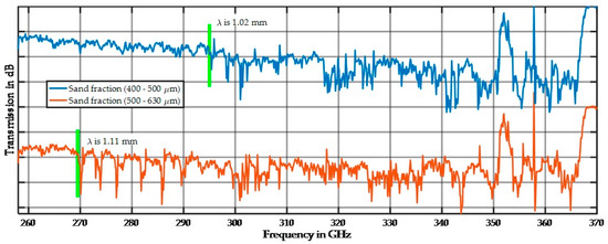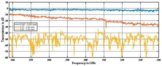 The influence of the particle size on the spectral behavior is demonstrated in Figure 8, Figure 9 and Figure 10. Figure 8 shows the spectra for the 45–63 µm, 300–400 µm, and 630–1000 µm fractions. All spectra are far away from the noise floor, and the prominent spiking up and down is reproducible as long as the sample position remains unchanged. After changing the sample position, the minima and maxima moved to slightly different frequencies, but the overall shape of the spectrum remains the same. The prominent spikes in the spectrum of the large fraction are extremely sharp. We assume that this is a result of resonant scattering in terms of multiple oriented scattering out of the main beam or highly distributed scattering in all directions.