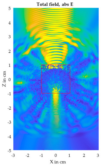 With respect to the soil sample behavior, a multiparticle solution is a more adequate model for a centimeter-thick soil sample. Celes software [32] (Karlsruher Institut fürTechnologie, Karlsruhe, Germany) for the Matlab environment enables scattering simulation of thousands of spheres in a randomly arranged cluster. Figure 5 shows the complex distribution of a scattered electromagnetic wave. This distribution changes with the random arrangement of the particles, and the transmitted beam has more or less energy depending on the number of maxima falling in the optical path of the beam.