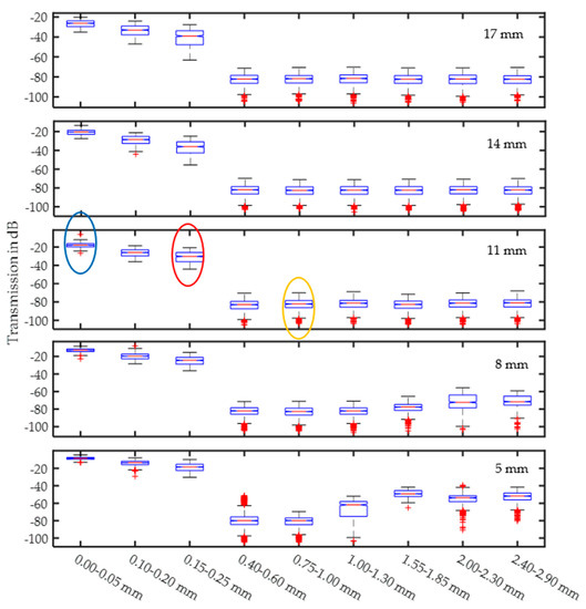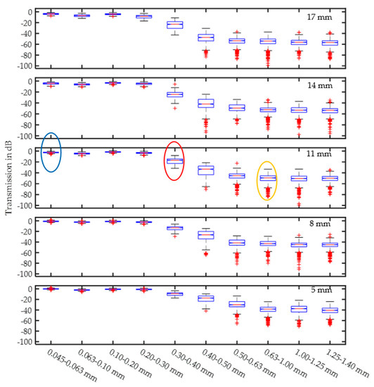 Figure 11 demonstrates that the damping increases as soon as the particle size reaches the range of half the wavelength. In the range of the wavelength, the damping saturates at a high level of approximately −60 dB for a 17 mm sample thickness. For particle sizes smaller than or equal to one-fourth of the wavelength, the damping saturates at small values. For all thicknesses, the 0.063–0.100 mm fraction has slightly higher damping. With respect to Table 2, the additives cannot be the reason for this damping because the values are decreased compared to those in the smaller fractions. Additionally, the sample thickness has a linear influence on the damping, while the shape and tendencies are similar. The number of outliers (red +) represents the extreme resonant scattering frequencies.