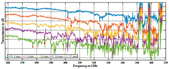Spectral behavior of five different sample thicknesses for the fraction from 400 µm to 500 µm. The red dots indicate the first spike in each spectrum. For better visibility, an offset of −10 dB was applied between each spectrum.