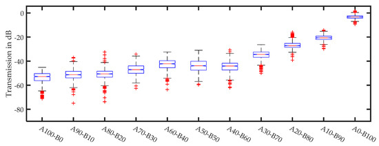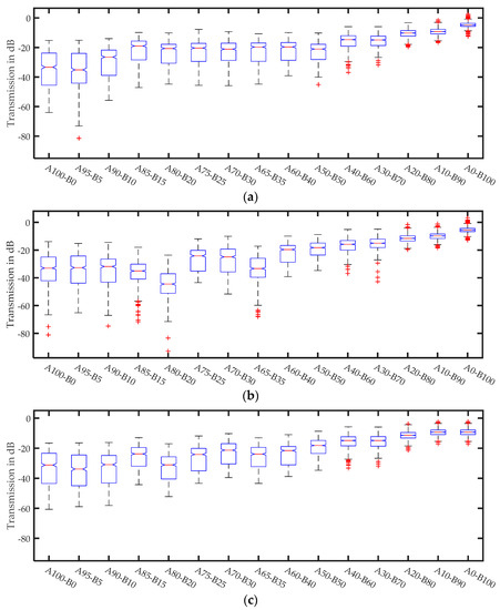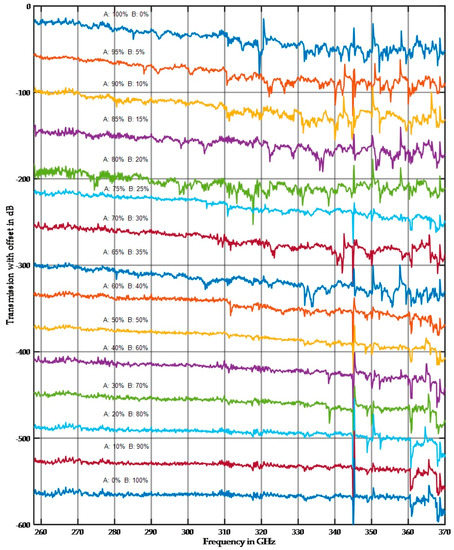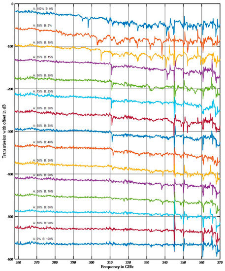 The results presented in Section 3.1.2 demonstrated that a single fraction can be distinguished by the averaged damping value if the particle size is approximately half the wavelength, but this distinction is more difficult to make for small and large fractions. However, the spectra shown in Section 3.1.1 demonstrated the large difference between the small and large fractions. The following section presents measurements on mixed fractions of quartz. Samples were composed of fractions A and B in different proportions on a percentage weight scale (e.g., 60/40). Figure 15 and Figure 16 show the results for the mixed fractions in a 10 mm sample holder. Multiple measurements were taken at different sample positions, and Figure 15 and Figure 16 show both possible extremes.