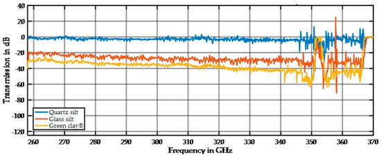 Depending on the parent material and the pedogenetic processes, the same particle fraction (e.g., silt) of different soils may have different chemical/mineralogical composition. Thus, with respect to soil texture assessment by THz radiation, it is of interest whether particles of the same size but different chemical composition show similar damping and spectral behavior. We addressed this question by analyzing silt and clay fractions of different mineralogical composition. We selected these fractions because the high surface area of the silt and clay fractions makes these particles the most important for absorption of water and nutrient ions. Figure 19 shows the transmission spectra from three materials with small particles.
