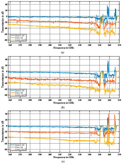 The different materials show a difference in their damping (offset) and frequency dependency. While Rayleigh scattering is very small for small particles, the scattering depends on the refraction index for similar particle sizes. The refraction index is a material parameter and thus the material of the sample modifies the absorption behavior. While our samples were made of different materials, they can be distinguished by their signal damping, as shown in Figure 20. Quartz silt is extremely transparent to the considered THz frequencies. Therefore, it is an ideal candidate for mixing with additives in future experiments.