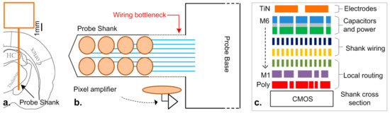 (a) Schematic of implanted probe reaching multiple areas inside a rat brain; (b) neural probe with shank wiring bottleneck limiting the number of electrodes; (c) typical CMOS (complementary metal-oxide-semiconductor) back end-of-line cross section, with six metal layers.