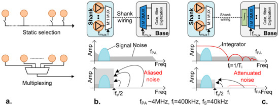 (a) Traditional approach (top) employs a static switch which allows only a single active electrode to be read at the same time, while the new approach (bottom) allows all of the active electrodes to be readout through multiplexing; (b) consequences of multiplexing without filtering; (c) filtering signal by integration reduces out-of-band thermal noise.