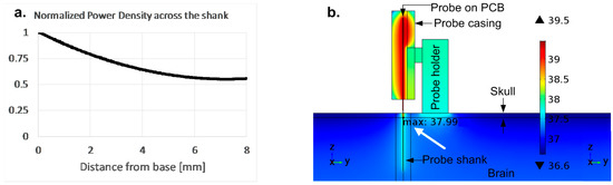 (a) Normalized power density across the shank due to increasing current and supply towards the base; (b) thermal simulations of probe with holder implanted in the brain, showing maximum temperature of 38 °C reached at the edge of the brain. This simulation was used to determine the maximum safe power that may be dissipated in the shank.