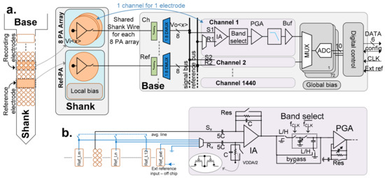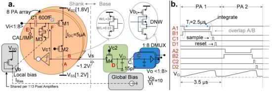 The need for large-scale neural recording across multiple brain areas in behaving animals has driven the recent development of high density neural probes [1]. In this application, the implanted probe shank needs to be sufficiently long to reach deep brain structures (Figure 1a), but it also needs to have a reduced cross section to minimize tissue damage. Active silicon neural probes that have been recently developed consist of a large number of tiny active electrodes that can locally amplify/buffer the neural signals [1,2,3,4]. However, with such limited space for each active electrode, the CMOS (complementary metal-oxide-semiconductor) pixel amplifiers (PA) underneath the electrodes are restricted to a bare minimum, while most of the signal processing is done in the ‘base’ (i.e., non-implantable part) of the probe.