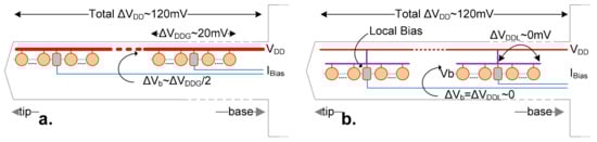 (a) Large supply drop across the 8 mm long shank changes the bias voltage, ΔVb. This is due to the high current in the supply rail (consumed by all PAs), that causes voltage drop within a bias region (ΔVDDG); (b) a tree-like power supply ensures that supply change ΔVDL is close to zero within each region, due to the lower current in the local rail. Each region contains its dedicated local bias generator.