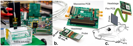 (a) Probe testing in saline solution attached to headstage, showing the back-end FPGA board in the background; (b) detailed view of probe and headstage connected to the mezzanine PCB (printed circuit board) through the flexible dual micro coaxial cable; the mezzanine board allows for connection of external battery for low noise and digital synchronization signals; (c) schematic display of probe implanted into animal.