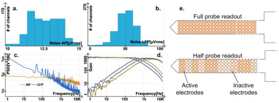 Adapted from [5]. Measurement results in half-probe readout, omitting the small number of defective channels; (a) distribution of noise in AP and (b) LFP band; (c) noise density in AP band (300 Hz–7.5 kHz) and LFP band (1 Hz–1 kHz); (d) different filter corner configurations, considering a fixed total gain of 1000; LFP high pass corners is below 1 Hz and not visible; (e) full probe readout and half probe readout allowing 6 random regions out of 12 to be active.