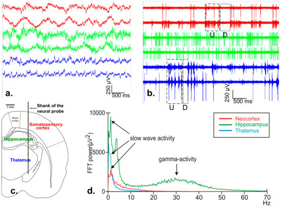 (a) local field potentials (LFP) simultaneously recorded from the neocortex (red), hippocampus (green), and thalamus (blue). Traces were obtained from the raw data recorded in LFP mode (internal reference, gain 500, low-pass 500 Hz); (b) multi- and single-unit activity recorded simultaneously from the neocortex (red), hippocampus (green), and thalamus (blue). Traces were recorded in action potentials (AP) mode (internal reference, gain 1000, high-pass 500 Hz). Dashed and dotted box indicate neocortical/thalamic up-states (U) and down-states (D); (c) schematic of a coronal rat brain section indicating the estimated position of neural recordings, d. fast Fourier Transform (FFT) plot of the recorded neural activity showing the dominant brain rhythms in the investigated brain areas during ketamine/xylazine anesthesia. Note that slow wave activity (1–1.5 Hz) appeared in all three brain structures, while high gamma activity (30–40 Hz) was present only in the hippocampus.
