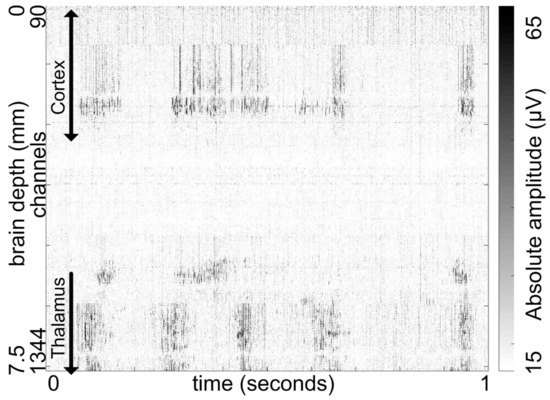 Representative spiking activity across more than 1250 channels of the probe shank, spanning approximately 7.5 mm of brain tissue. The raw data is shown. The spike-map was constructed from 1 second of data recorded in AP mode; the time series of each channel’s data is plotted as a horizontal line using brightness to encode the absolute amplitude, with darker areas being an indication of neural spiking activity. Ketamine/xylazine anesthesia induces slow wave activity (with a peak frequency of 1–1.5 Hz) or delta rhythm (1.5–4 Hz) in the neocortex and thalamus, which can be observed as a rhythmic alternation of high and low spiking activity. Notes: the first ~90 channels are not displayed as they were outside of the brain and only recorded noise; the picture requires one line per channel (~1250), therefore resolution of the provided image was scaled down. Occasionally neurons near the reference electrode may spike, causing a line to be displayed on all channels using that specific local reference. Such artefacts can be eliminated during offline processing.