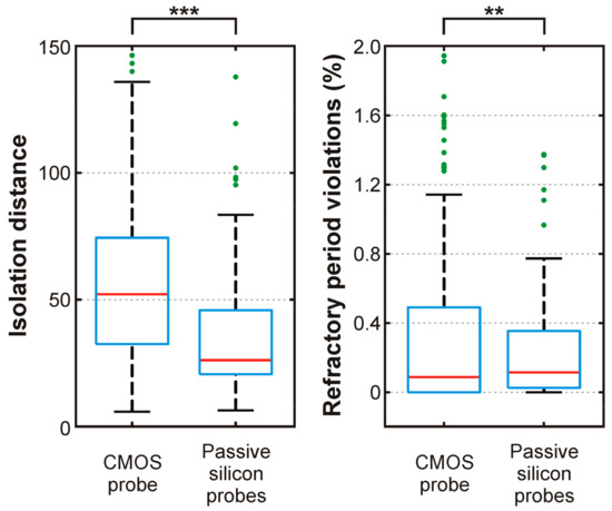 Cluster quality metrics (isolation distance and refractory period violations) calculated for single units recorded with the CMOS probe (n = 247) and with passive silicon probes (n = 101). Red line: median; blue box: 1st quartile–3rd quartile; whiskers: 1.5× interquartile range above and below the box; green dots: outliers. Extreme outliers are not displayed (isolation distance: 12 data points from the CMOS probe data ranging from 183 to 475; refractory period violations: 22 data points from the CMOS probe data ranging from 2.2 to 13.1 percent and 3 data points from the passive silicon probe data ranging from 2.8 to 4.2 percent). **: p < 0.01; ***: p < 0.001.