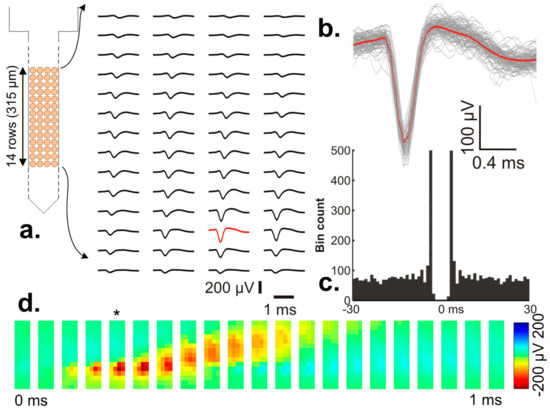 (a) The mean spike waveforms of a putative neocortical pyramidal cell captured on 4 × 14 electrodes. The waveform with the largest peak-to-peak amplitude is colored red; (b) individual spikes (waveforms in gray color, n = 90) of the same pyramidal cell recorded by the electrode corresponding to the red waveform in panel a. The mean spike waveform is displayed in red color; (c) the autocorrelogram of the demonstrated pyramidal neuron (bin size: 1 ms). The two peaks indicate burst firing (multiple spikes fired in rapid succession); (d) Color-coded potential distribution maps corresponding to different time points of the mean spike waveform. The maps are visualized according to the layout of the 4 × 14 electrodes. The potential map corresponding to the time point of the negative peak of the mean spike waveform shown in panel b is indicated with an asterisk. Note the temporal propagation of the negative peak of the spike (red patch) from lower electrodes to upper electrodes. The spikes of the neuron were recorded in AP mode (internal reference, gain 500, high-pass 500 Hz).