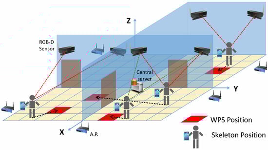 Figure 1. This central server is responsible for obtaining the required data and carrying out positioning calculations. The WPS makes use of several Access Points (APs) located around the environment (i.e., routers), which are within reach of the users’ cellphones. Cellphones measure the level of the received signals and send data to a web server. Simultaneously, each RGB-D sensor records a part of the scenario, by means of a camera and an infrared projection system, obtaining depth maps. These are processed to identify the skeletons of people and to refine the results delivered by the WPS, providing more accurate values for positioning. Finally, the central server obtains the positions of people and returns the calculated values to the cellphones.