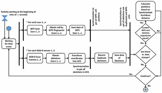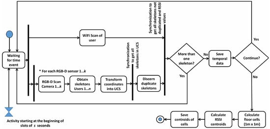 Figure 2 shows, with an activity diagram, the different steps during this process. RSSI values from the cellphones, together with their position estimated by the depth sensors, are recorded on a