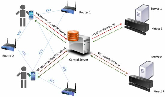 Figure 4. Concurrently, each RGB-D device is connected to a different web server, which sends the data to the central server. Furthermore, finally, this central server computes the result of the position merging WPS and RGB-D outcomes for each time stamp.