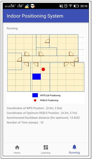 Users’ smart-phones have established a connection to the local WiFi network. The smart-phones have obtained RSSI data and these were synchronously sent to the central web server, via SOAP protocol. At the same time, this central web server has started 20 different threads. Each thread has called a different web service to obtain the skeletons and each web service has been hosted in the respective server connected to the associated Kinect. When these threads have finished, the complete information has been saved and processed. An Android application, with Training and Operational mode, has been developed. It tracks the user’s position by means of WPS and the developed IPS (see