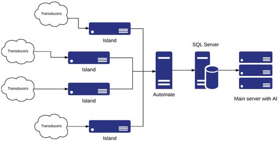 LIARA and DOMUS laboratories aim to study how smart homes can assist people with cognitive deficiencies. They use very similar architecture, represented in Figure 1, to test their algorithms and solutions []. Inherited from the industry, they use some islands, made of industrial-grade hardware, to agglomerate transducers. Then, an automate is in charge of getting back, from the islands, the values of the sensors or changing the values of the effectors. To end this process, the automate will update a relational database hosted on an SQL Server in order to provide a simple interface for other systems like, in this case, artificial intelligence. These two smart homes present some interesting features we have to discuss. First, the use of industrial-grade hardware means that all the components have been tested for continuous use in a far more complex environment than just a house (e.g., a production line in a factory). Therefore, excellent reliability is demonstrated even if the smart home has to operate at all times. The second main advantage of these environments comes from the highly centralized architecture itself. Indeed, all the values coming from sensors and all the actuator controls end up in the same database. As a result, interaction is facilitated with the home since this kind of storage offers an easy way to retrieve sensor values or interact with actuators.