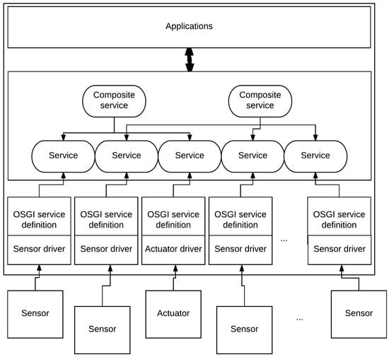 Gator Tech [] is a project based in Florida. Its main goal is to prove the feasibility of a low-cost smart home where the integration of new transducers will be easy. To this end, the authors present an Open Service Gateway initiative (OSGI)-based architecture [] that is summed up in Figure 2. Each transducer has a simple electrically erasable programmable read-only memory (EEPROM) containing the driver to communicate with it. Once powered, the transducer registers itself by sending its driver for OSGI service definition. This will act as an abstraction layer to create basic services that allow the consumption of highly abstracted data (e.g., “sunny” instead of 10,000 lumen for a light sensor) or the combination of basic services for a composite service (e.g., the creation of a voice recognition service using all the different microphone services). All this architecture allows developers to create applications without any knowledge of the underlying communication and with only highly abstracted data, which simplifies development.