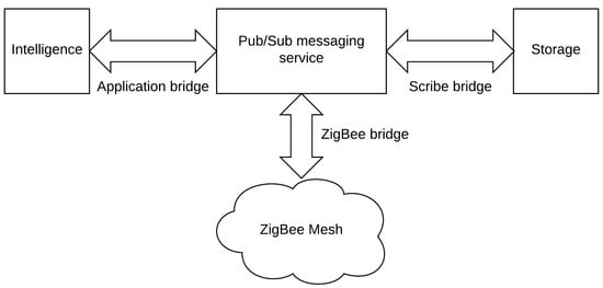 CASAS [], also known as the "smart home in a box", is an infrastructure where the emphasis is put on the price and ease of installation. Depicted in Figure 3, the architecture is divided into four main elements. The first one is the ZigBee mesh which represents all the transducers communicating between them in a network where each node relays the information to its neighbors using the ZigBee protocol. This mesh sends events using a publish/subscribe (pub/sub) messaging service through a ZigBee bridge in charge of converting events to higher-level eXtensible Messaging and Presence Protocol (XMPP) messages. The messaging service allows other applications to easily integrate the infrastructure and use the transducers. By default, there are two services: storage and intelligence. The first archives all the events occur in the environment by using the Scribe bridge. As for the intelligence, it is in charge of energy monitoring and the discovery and recognition of any activity that can happen in the house.