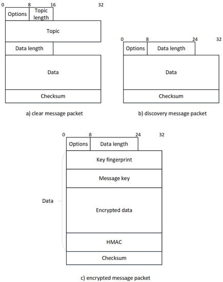 Figure 4a represents a single and unencrypted data message in our solution. Every packet begins with an options byte, divided into two parts. The first three most significant bits (MSBs) comprise the version number of this packet and is all set to 0 for the version we present here. The other bits are reserved and unused, except for the two least significant bits (LSBs) which represent flags used in the discovery and encrypted mode and have to be set to 0. These options are followed by the topic length, which can range from 1 to 255 characters encoded on a single byte. Any message without a topic has to be considered as an error and be forgotten. Next comes the topic with a variable length defined previously followed by the data length encoded on two bytes (the protocol tolerates empty data packages) and the data associated. Finally, a checksum is computed with the whole packet by using the cyclic redundancy check (CRC)-32 algorithm already used in the Ethernet frame which is a fast and lightweight hash algorithm. It has to be noted that the maximum size of one packet is limited by the theoretical limit of UDP which is 65,535 bytes. When a client receives a packet, the first operation to be performed is the checksum validation. If this fails, the packet has to be dropped as the protocol does not have any mechanisms to send the packet again. Otherwise, the packet can be split by using the different sizes and the data and topic can be easily read.