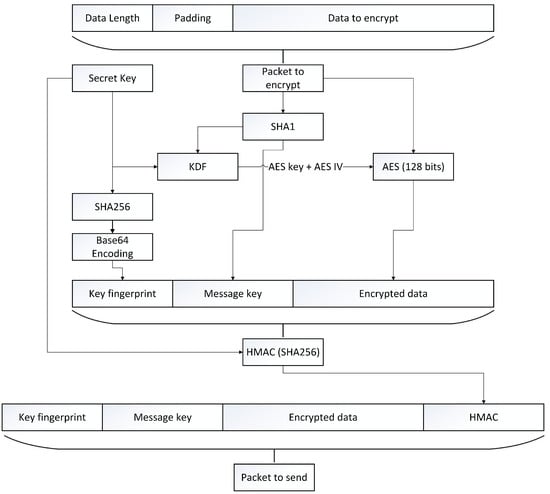 When the packet is ready to be encrypted, we create the message key used to generate the AES key and initialization vector (IV) by computing the Secure Hash Algorithms (SHA)1 of the packet to encrypt. This hash is given to a key derivation function (KDF) with the secret key preconfigured by using the configuration channel. The KDF presented in Algorithm 1 is a sequence of different SHA1 hash and will result in two values, the 128-bit AES Key and AES IV used to encrypt the packet with AES. Next, in order to identify the secret key used to encrypt, we compute a unique fingerprint of it by using the Base64 representation of the key SHA256. Finally, the hash message authentication code (HMAC) is computed by using the secret key with the SHA1 hashing algorithm.