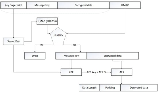 In order to decrypt an encrypted packet (identified by a 1 at position 1 in the option byte of the header) the receiver has to perform some operations, as summed up in Figure 6. The first task to accomplish is the verification of the HMAC to ensure the authentication and the integrity of the packet. To accomplish this, we first have to retrieve the preconfigured secret key used to encrypt, identified by its fingerprint. Next, we can compute the HMAC of the packet (without the sender HMAC) and check for equality. If the two hash message authentication codes are different, the packet must be dropped, otherwise, the decryption process can begin. First, we have to reconstruct the AES key and IV used to encrypt the message by passing the preconfigured secret key and the message key received in the KDF algorithm presented earlier. Next, we can use the AES 128 algorithm in decrypt mode with the generated key and IV to finally decrypt the whole message. The final step is to remove the padding bytes, which can be easily done with the message size store in the first two bytes.