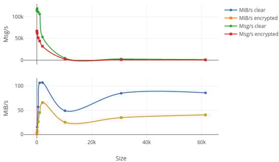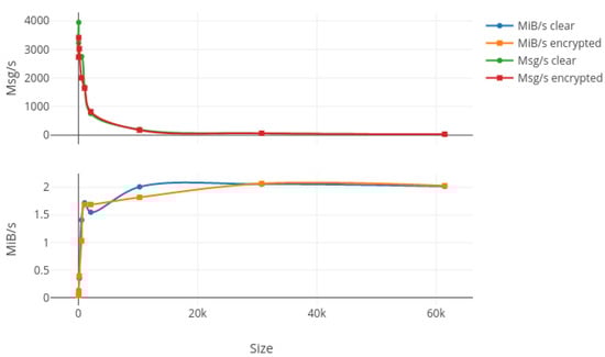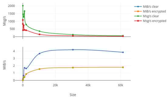 Bandwidth results in terms of Msg/s and MiB/s for 10,000 packets sent on the Raspberry Pi 3 hardware with increasing message size in both encrypted and clear modes.