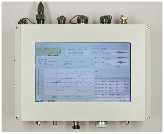A MPwise unit. This version includes a touchscreen embedded in the housing. While this arrangement is not standard, an external touchscreen can be connected to all units. In this image, the touchscreen display shows the operation of the onsite EEW software described in [5,6,7]. The dimensions of the latest version are: length 20.5 cm, width 16 cm, and height 8 cm.