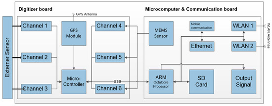The system is designed in a modular manner, hence allowing different configurations of sensors and communication interfaces to be employed, depending on the case at hand. Such an arrangement would also help in future developments when the system is expanded from seismic to other hazard types. The current MPwise hardware (Figure 1) consists of three main parts, as shown in Figure 2, which presents a schematic overview of the system’s architecture, namely the digitizer board (see Table 3), the microcomputer and communications board (see Table 4), and the external sensors.