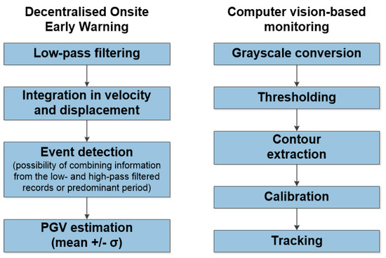 Different methods of analysis are under development and implementation, dependent upon the response time required by the application (e.g., real-time for early warning, near-real-time for rapid response), either using directly the capabilities of each single node that constitutes the self-organizing network, or in a more centralized early warning center. The processing steps at the node level are being designed to be suitable for on-site early warning and the assessment of the predicted damage of buildings, computer vision-based monitoring, displacement estimation by joint processing of single-frequency GNSS and MEMS-accelerometer data, and the running of an automatic, audio-visual alarming system (which would involve using either the embedded or external touchscreen display, external loudspeakers and/or other external devices). For example, Figure 3 (left), shows the processing steps for one of the EEW options, termed decentralized on-site early warning [5,6,7], and for the computer vision-based monitoring application (see Section 6). With regards to other sensor types that may be attached to the MPwise, an example could be the use of external GNSS units (see [14]), for example, the u-blox GPS module (https://www.u-blox.com/de), which may be used in conjunction with the double-integrated acceleration data recorded by the internal MEMS (note, this GNSS module is in addition to the one used for the time stamping). In the following sections, we will present some examples of the different applications of the MPwise. One of the software tools installed on the MPwise is the GFZ-Sentry (GFZ-Sentry is being developed by GFZ in collaboration with gempa GmbH). This is a software application that runs in real-time and analyses the recorded ground motion for on-site and decentralized early warning. The software, which has been tested extensively on off-line recordings [7] exploits the first three-seconds of a triggered signal to determine (making use of empirical relationships) what the potential ground shaking at a site will be, which is then used to make a decision as to whether to issue an alarm (and of what type) [5,6,7].