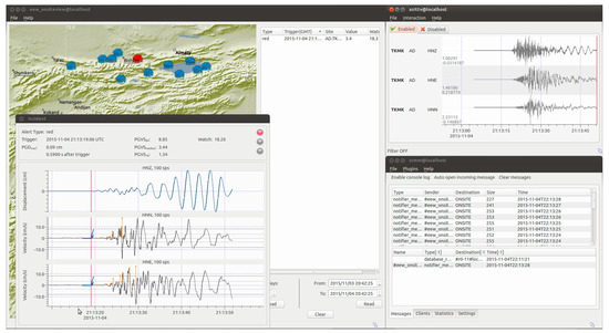 Example of output from the Seiscomp3 system implemented within the EEW software module of the MPwise, based on the GFZ-Sentry software developed at the GFZ [5,6,7] for the case of the Kyrgyz Republic. Note that this processing and associated images may be produced by a data center computer connected to the recording network, or on the touchscreen embedded in or connected to one of the units themselves (see Figure 1).