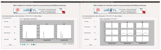 Example of output for short-time building measurements (note, this is the Graphical User Interface (GUI) developed for the SIBYL project for the case of the AHEPA hospital in Thessaloniki, Greece. The results may be viewed either on an embedded or external touchscreen). (a) Spectra computation to identify the resonance frequencies of the building. (b) Interferometry plot to evaluate the shear wave velocity inside the building.