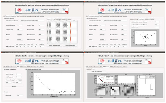 Output from the MPwise processing of seismic array data for site assessment (note, this is the Graphical User Interface (GUI) developed for the SIBYL project). Top left) The data source and parameter menu allows the user to configure different parameters, such as the number of stations, network code, sampling rate, channel identifier, digitizer and sensor specific constants, etc. Top right) Overview of the array geometry. Bottom left) Real-time processing of the array measurements using the extended spatial autocorrelation (ESAC) method [29] to obtain a Rayleigh wave dispersion curve. Bottom right) SVD (Single Value Decomposition) inversion to obtain a 1D shear wave velocity model, as well as a quality control provided by Jacobian, model and data resolution matrices.