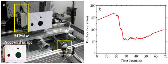 (a) The experimental set-up for the displacement measurements using a camera connected to a MPwise unit; (b) The displacement of the target point (red cross in the processed image in (a) as determined from the camera images.
