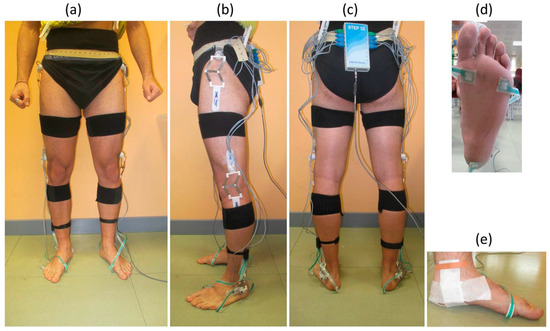 H-Gait and STEP32 sensor positioning. The images show the (a) frontal, (b) lateral and (c) rear view of a subject prepared for the bi-instrumented gait analysis: the MIMU sensor positioned below the medial malleolus is shown in panel (d), the footswitches in panel (e).
