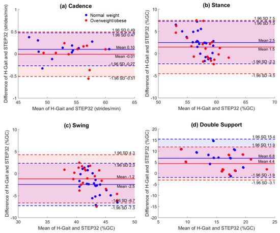 Bland-Altman plots: spatiotemporal parameters. Bland-Altman plots are shown for (a) cadence; (b) stance; (c) swing and (d) double support, for normal weigh subjects (blue dots) and overweight/obese subjects (red dots). In each plot, the mean and LoA (mean ± 1.96 SD) are shown for both groups. Values from left and right lower limbs were represented as separate dots, except for cadence, where left/right values were averaged.