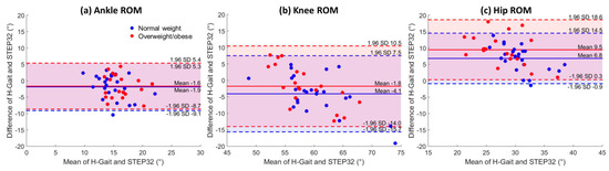 Bland-Altman plots: joint ROMs. Bland-Altman plots are shown for (a) ankle ROM; (b) knee ROM and (c) hip ROM; for normal weigh subjects (blue dots) and overweight/obese subjects (red dots). In each plot, the mean and LoA (mean ± 1.96 SD) are shown for both groups. Values from left and right lower limbs were represented as separate dots.