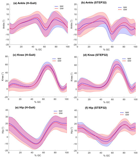 Some studies have validated inertial sensor systems for what concerns spatio-temporal parameters [6] and the joint kinematics [19,34]. However, to the best of our knowledge, such a validation was not provided for potentially “problematic” conditions such as overweight and obese subjects. In this study, we compared the joint kinematics curves obtained with H-Gait and STEP32 on normal and overweight subjects. Overall, ankle, knee, and hip curves obtained with the two systems showed similar morphologies, both for NW and OW group (Figure 4). The dispersion of the hip joint curves was slightly smaller using STEP32 system with respect to H-Gait. It can be observed a profile with bumps in STEP32 curves of OW subjects, especially in the hip and, to a lesser extent, in the knee kinematics. This can be most probably related to soft tissue artifacts that are expected to be more pronounced in OW subjects. In contrast, soft tissue artifacts were not evident in H-Gait curves, probably due to the different sensors positioning and the fixation with elastic bands.