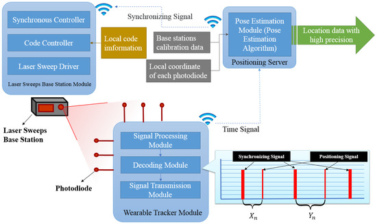 Our tracking system consists of three key components: a laser sweeps base stations module, a wearable tracker module and a positioning server, as shown in Figure 1. The function of base station are providing encode control and synchronous control. The local code information is given in advance (the pulse width of synchronizing signal denotes the following line laser from which base station), a LED (Light-emitting diode) array is used for transmitting a sync signal, horizontal and vertical laser sweeps, which are represented as laser sweep driver in Figure 1, and a photodiode, allowing for synchronization between stations when free of cables. The wearable tracker module contains multiple customizable photodiodes with relative position fixed, each of which will pick up signals from base stations and use them to determine the azimuth and elevation angles relative to the base station individually. The photodiode performs preamplification, filtering and quantization of the received laser scanning signal. This is done through the ARM (Advanced RISC Machine) single-chip decoding circuit, which receives the quantization signal to capture, statistics and decoding. The decoded signal is passed through the convert serial port to wireless chip to the positioning server. The input of the positioning server pose estimation algorithm includes the calibration data of each base station, the three-dimensional local coordinate of each photodiode, and the decoded time signal, which is obtained from the wearable tracker module, while the output of positioning server is location data with high precision.