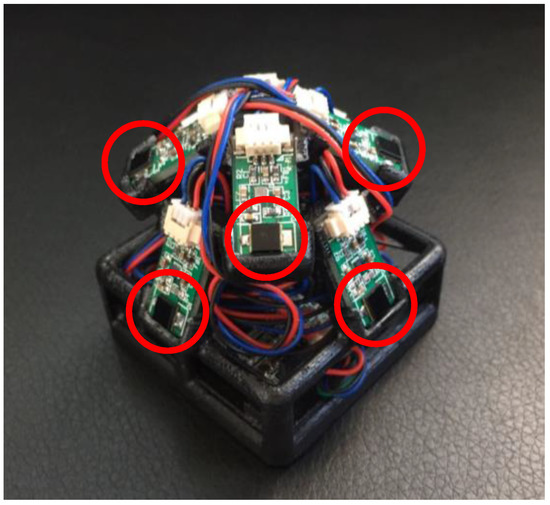 Figure 4. Tracked object consisting of three photodiode sensor boards. The photodiodes are circled in red.