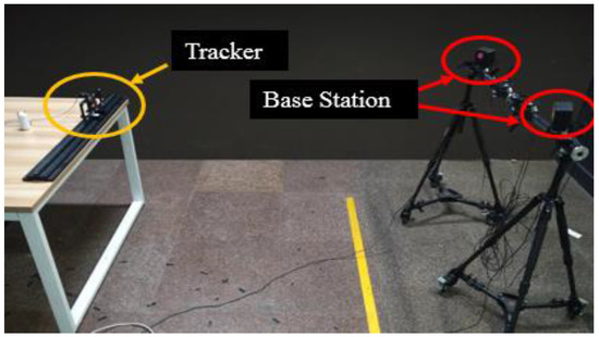 The equipment of our system includes a slide guide, two sliders, a charge pal (which supplies electricity to the tracked object), a tracked object and two HTC Vive base stations. The experimental environment is shown in Figure 6. Three distances in space (1 m, 3 m, 5 m from the base stations) are specified for the test, then in each distance we test the precision along different directions (x-axis, y-axis, z-axis) of the world coordinate. The tracker is installed on the slider, which is moved from 15 cm of the slide guide to 65 cm (step, 2.5 cm), and we pin down the origin of the world coordinate when the tracker is laid on 15 cm. After the tracker is fixed on each position, 1000 valid sets of the tracker’s center coordinates in a virtual environment are collected. Thus, we get 21 × 1000 datasets for each direction/distance. We can obtain the displacement distance from the data of the latter position and the corresponding data of its previous position. We define | X u X u ^ | as the absolute error, X u ^ is 25 here, and the unit is mm.