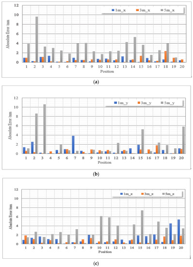Figure 7. Average range error and at different distances (1 m, 3 m and 5 m). The blue bar refers to the result obtained when the tracker moves along the x-axis; the orange bar denotes to the result obtained along y-axis and the gray refers to the result obtained along the z-axis. (a) Average range error at 1 m away from the base stations; (b) Average range error at 3 m away from the base stations; (c) Average range error at 1 m away from the base stations.