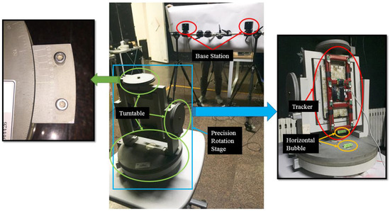 In order to test the angel accuracy of our algorithm, we stick tracker on a three-axis turntable. There is a built-in bubble on the tracker, so this guarantee the axis of tracker horizontal. In this way, we ensure that the tracker approximately rotates around the only axis. Our angle-measurement system is shown in Figure 8. Three distances in space (1 m, 3 m, 5 m from the base stations) are specified for the test, then in each distance we test the angle precision along different axis (x-axis, y-axis, z-axis) of the world coordinate pivoted. We rotated the tracker from −65° of the rotary stage to 65° (step, 5°), and we pin down the origin of the world coordinate when the tracker is laid on 0°. After the tracker is fixed on each position, 100 valid sets of tracker’s rotation matrix in virtual environment are collected and took average. Thus, we get 25 datasets for each spindle/distance. We use the method in the code of [12] to calculate the tracker’s corner relative to the previous position. The experimental results are shown in Table 2.