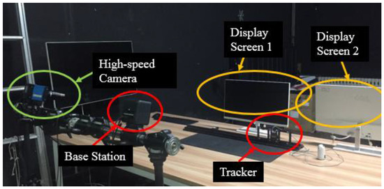 The device for latency test includes a 1000-frame high-speed camera, a set of dual-screen computer, an optical slide, two base stations and a tracked object which is shown in Figure 10. We use the high-speed camera to capture the tracker’s movement in both the virtual three-dimensional space and the real world. An indicator light is installed on the tracker so that we can observe the movement of the tracker clearly. When the tracker is quickly dragged on the slide, screen 1 shows the tracker in the virtual three-dimensional space, and screen 2 serves as a monitor. The high-speed camera is used to record the entire process of the tracked object from stationary to swift motion. After the shooting is complete, the video is played frame by frame. The latency of our system is obtained by multiplying the frame rate, which is known, by the difference between the frame number when the tracker begins to move in the virtual space and its counterpart in the real world. The average latency of five measurements is less than 0.047 s.