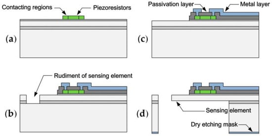In structure manufacturing, the rudiment of the sensing element is patterned by the inductively coupled plasma (ICP) process. The BOX serves as an etch stop layer, and a Bosch process with short etch cycles allows a smooth perpendicular fence edge. The naked BOX is removed ahead of the back-etching process to simplify the release process (Figure 1c). The bulk silicon underneath the fence is etched by ICP (the patterned Al-layer is used as the etching mask), and when etching stops at the remaining BOX, the sensing element structure is directly released at the same time (Figure 1d).