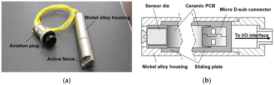 A high-temperature package was designed, as shown in Figure 3. Its overall dimension was 69 mm in axial length and 15 mm in diameter. Several types of materials in regard to thermal conductivity are adopted. The outer housing made of nickel alloy was plasma-sprayed with the thermal barrier coating (TBC). A sliding plate made of stainless steel with a polishing process was used for accurate installation for the micro fence sensor. The chip wiring was routed out through a ceramic PCB to a micro USB connector, which allows for plug and play. This terminal was then wired to an aviation plug, which was used as the input/output interface.
