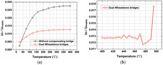 In this case, the residual temperature drift of the sensor was determined, as shown in Figure 4a. A four-order polynomial was suitable while fitting the zero-drift curves. The sensor offset voltages started with a monotonically increasing trend but gradually leveled off after 250 °C, and even if the temperature rose to 400 °C, the outputs still exhibited good stability. It could also be seen from the diagram that the dual Wheatstone bridges design significantly inhibited the temperature dependence of the offset voltage of the sensor, compared with the outputs without a compensating bridge. The sensor outputs did not remain stable as excepted when the temperature rose above 420 °C, as shown in Figure 4b. This problem is probably derived from the deterioration of the electrical connection performance and the precipitation of the implanted ions. Impurity-doped polysilicon has conductivity, and these ions are somewhat similar to the ferroelectric domains of PZT. However, different from PZT’s transition phase change and depolarization [19] caused by high temperature, the main reason for performance deterioration of the fence sensor at higher temperature is the transition from the semiconductor to the intrinsic semiconductor. With the increase in temperature, the intrinsic carrier concentration gradually increased. When the intrinsic carrier concentration approached the impurity carrier concentration, the electrical performance of the sensor became unstable. As the temperature continued to rise, the semiconductor became an intrinsic semiconductor, and at the same time, the sensor became invalid. Note that the sensor involved in the tests has not yet been packaged, so the obtained maximum operating temperature of 400 °C only refers to that of the sensor itself.