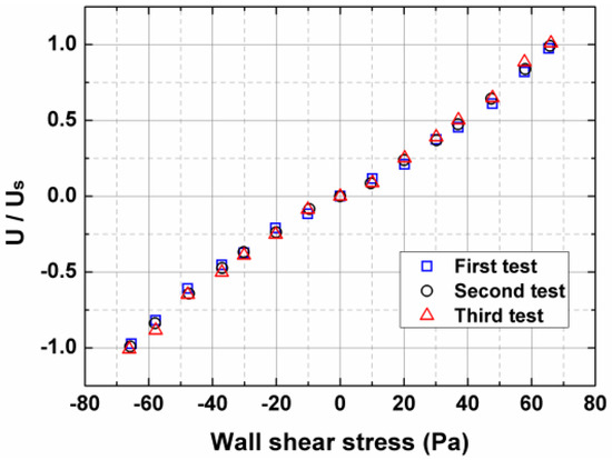 The output signals of the fence sensor, as a function of the wall shear stress, are plotted in Figure 5. The Mach range of the flow is 0.3~0.65, and the corresponding Reynolds number ranges from 7.3 × 104 to 2.6 × 105. Good agreement can be observed in these three repeatability tests. However, because of the possible influence of the turbulence structures, the scatter in the data occurred at higher Reynolds numbers. The calibration curve is not a straight line, and this non-linearity response has been noted before [21]. The active fence height was specially selected, which ensured that the fence lay within the viscous layer. Note that the negative wall-shear-stress values are actually obtained by rotating the sensor 180 degrees.